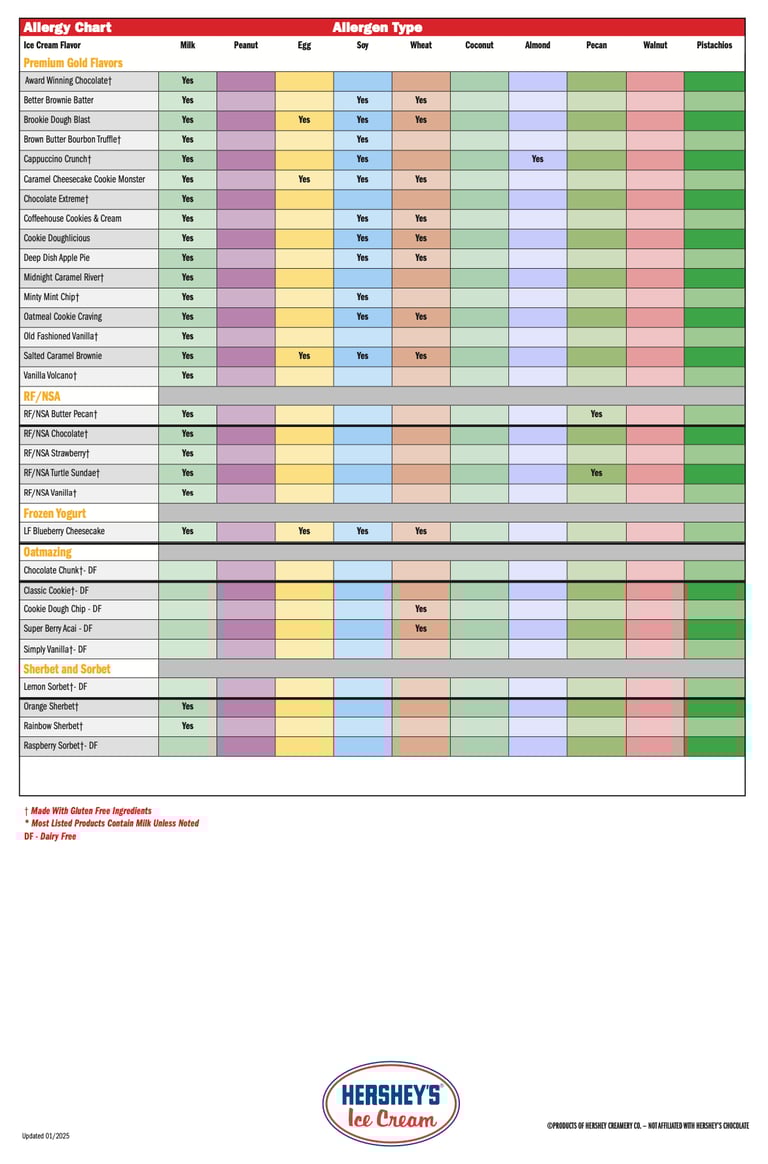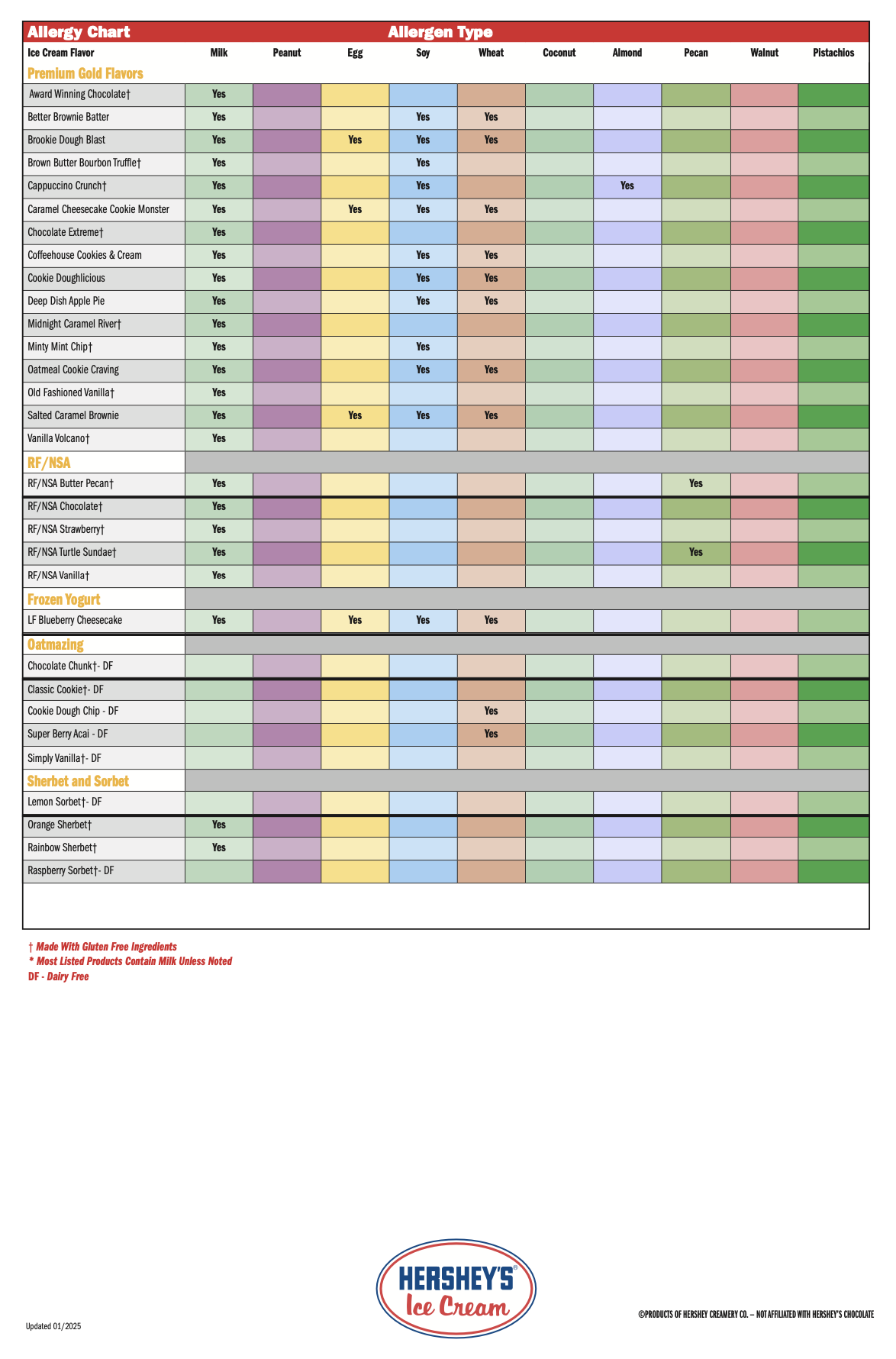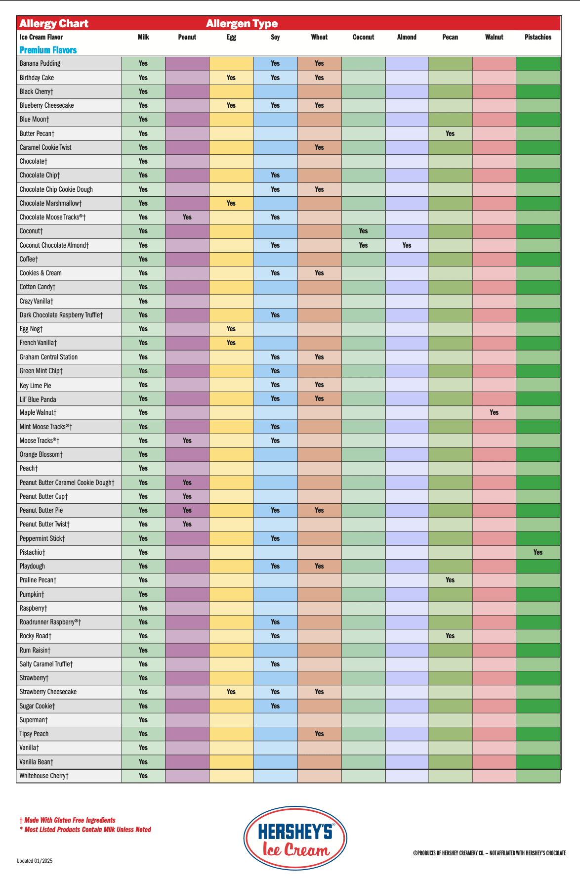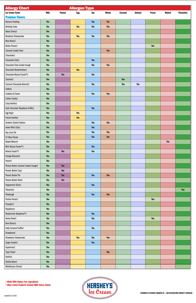 Here at Scoops on Main, we exclusively carry Hershey's Ice Cream. We have attached below all relevant allergy information